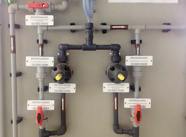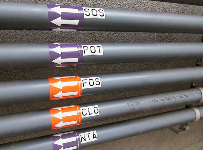 Señalización del fluido con texto, sentido del flujo y color según norma. Marcado de origen y destino.